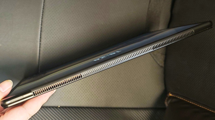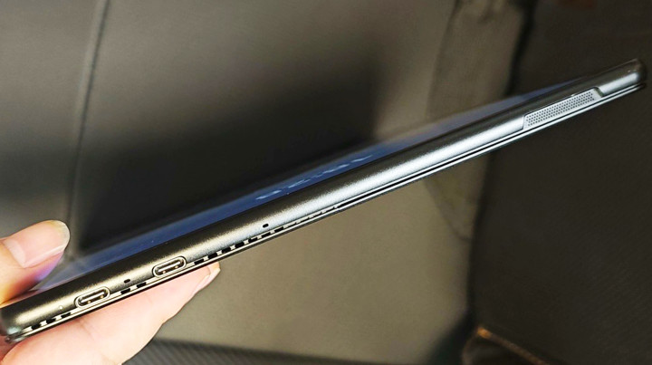 翻转化身到中框与后盖,更多野心的各别点逐个呈现。像A550的机身中框形势,莫得效当卑劣行的直角边,而是传统的圆弧过渡形势,斜角很大,弧度逐步下落,贴抓掌。细节上,A550中框的拓展接口与按键,形势也与其它win系统的平板不同,傍边中框上的对称式扬声器作念成了零丁的音腔,并非平直开孔在中框上。其次,机身上的散热孔放在中框顶部,一溜张开,孔阵开孔面积大,十分注意,散热服从也当然不低。在高功耗场景,能明显感受到散热孔的热量往外冒。
