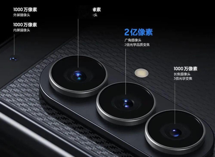 影像部分,表里屏均配备了1000万像素前置自拍录像头,后置 2 亿像素ISOCELL HP2广角主摄、1200 万像素超广角镜头、1000 万像素长焦镜头组合,复旧光学变焦3倍、光学品性变焦2倍、数码变焦30倍。