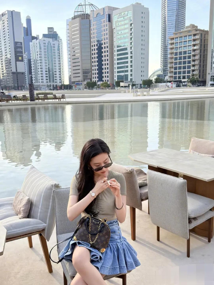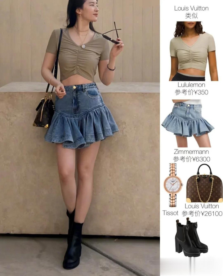 她的穿搭也被粉丝扒出了同款,四肢天梭代言东谈主,腕表是天梭的,上衣是lululemon的,牛仔半裙则来自Zimmermann,价值6000多。脚上的靴子。来自lv,她出席F1行为,穿的亦然这双靴子!