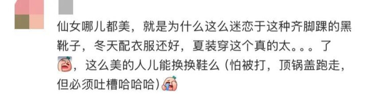 不说别的,夏天穿这种玄色靴子就很不颜面,淌若不是刘亦菲穿,往常东谈主上身了真实是不幸。即使刘亦菲穿,也没那么颜面,在穿搭上,确乎得下点功夫了。