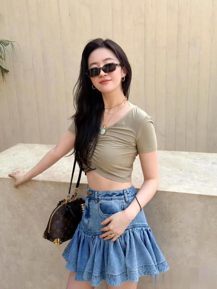 刘亦菲一头长发披垂下来,背着LV的包包,身穿灰绿色露脐上衣,搭配牛仔半裙,已经挺失业的。