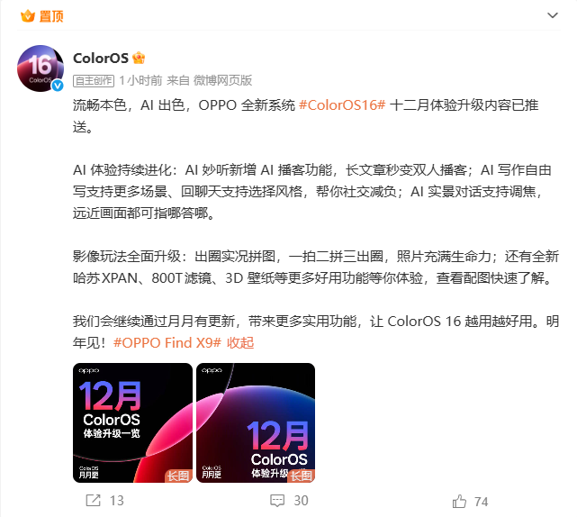 全勤奖颁给ColorOS! 每月准时更新, 12月重磅功能连发